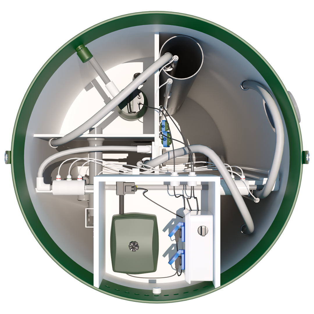 Распределительно-регулировочный узел размещён на внешней стороне стенки камеры с компрессорами. Из него идут воздуховоды к каждому потребителю станции автономной канализации.